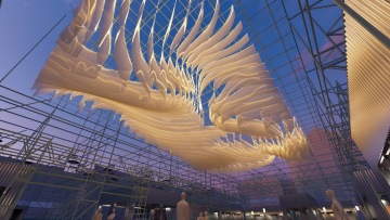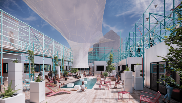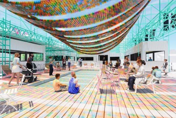 With this in mind, the jury decided to give an honorable mention to the proposal “Sensing Summer” by Julie Chan and Annika Babra of Yale Architecture, based in New York City. “Through a series of microclimates that speak to different landscapes of summer, the project overlays the Manifesto Market’s programmatic and structural grid into a system of shading, cooling, and gathering. Drawing from the ethos of reuse with repurposed scaffolding and shipping containers, the project’s materiality uses tricolor construction nets to evoke unique summerscapes: mountains, lakes, and beaches through coordinated light, sound, and mist,” the fresh graduates explained.