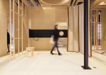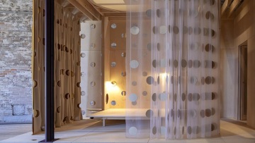 Reinhard: Yeah, of course. This pavilion is gorgeous and beautiful. We wanted to create an installation that goes into a dialogue with the pavilion, and to keep a landscape, lower installation that connects to the ground. It's built in timber, in contrast to this concrete structure and this incredible, beautiful roof with the brise-soleil and the special light to keep that perfectly intact. So the dialogue between this landscape and the roof was important for us, and that the common space is organised around these three fantastic trees in the pavilion.